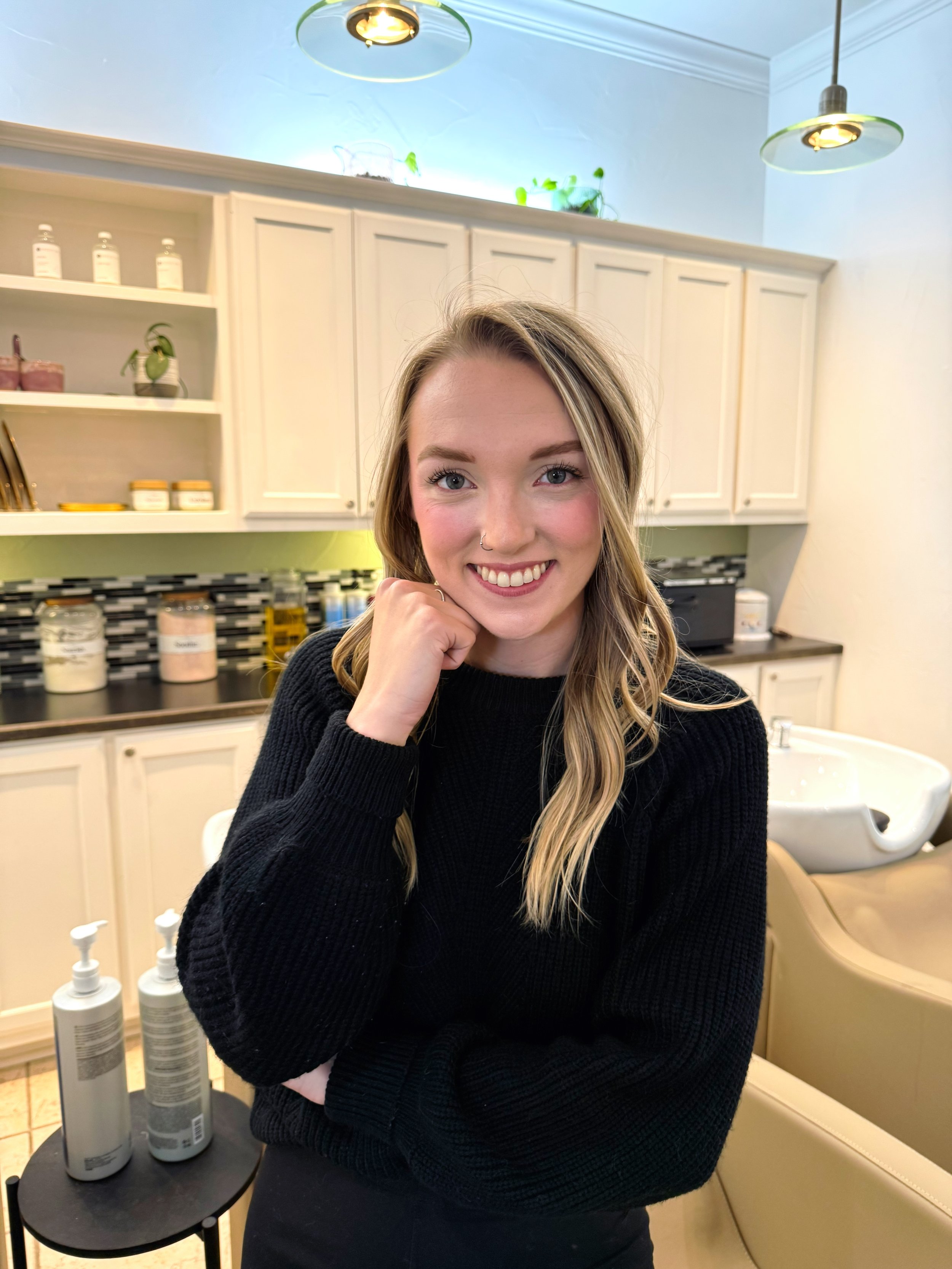 “Hey, I’m Elaina — or Laina! I specialize in color and lightening services. I’ve been passionate about hair since I was 13 and now get to live that dream behind the chair. Helping people feel confident and beautiful is truly my favorite part of this career.